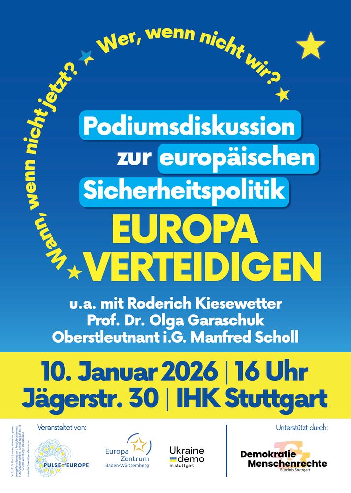 «Wann, wenn nicht jetzt? Wer, wenn nicht wir? Europa verteidigen», fragen wir daher in die Runde am 10. Januar 2026, ab 16 Uhr, in der IHK Region Stuttgart. Denn wir werden reden mit Roderich Kiesewetter (MdB), Prof. Dr. Olga Garaschuk (Vorsitzende der Deutsch-Ukrainischen Akademischen Gesellschaft), Oberstleutnant i.G. Manfred Scholl (Bundesakademie für Sicherheitspolitik) und einem Mitglied des Stuttgarter Jugendrats. Wie auch mit Ihnen, die wir Sie dazu von Herzen einladen!