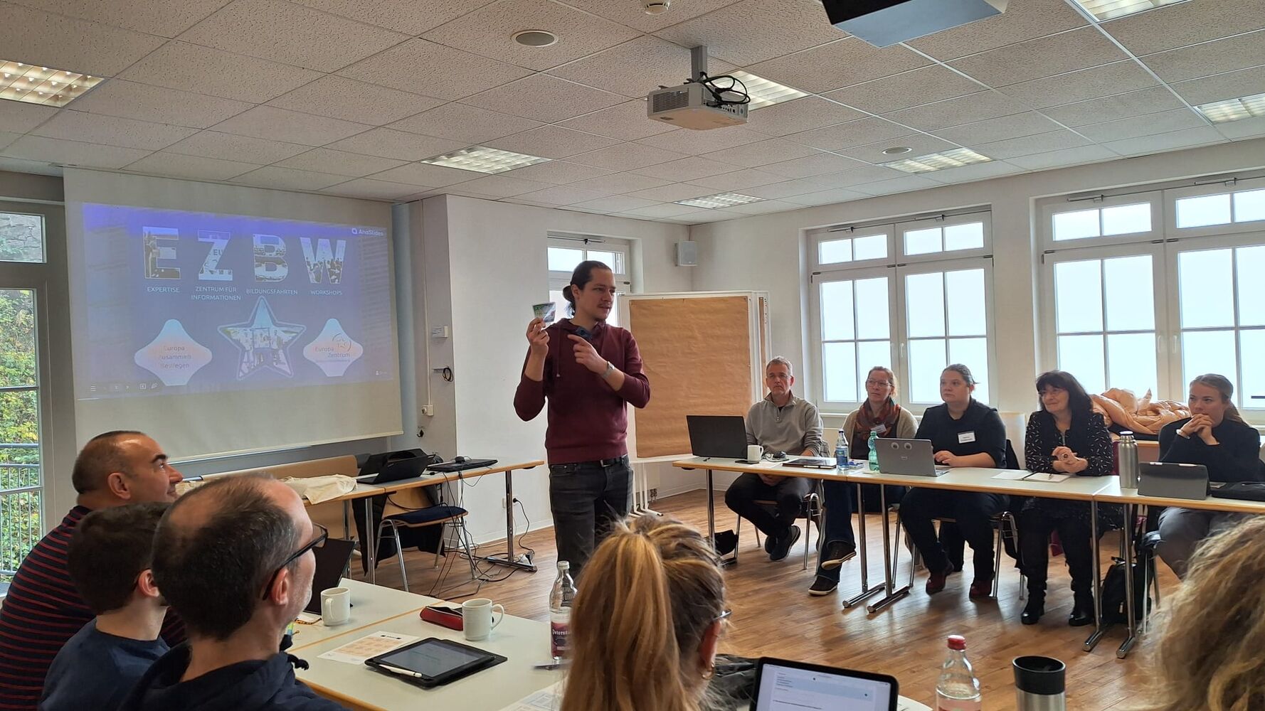 30 Lehrkräfte aus ganz Baden-Württemberg und ein paar Gäste aus Nordrhein-Westfalen konnten in diesen drei Tagen ihr Wissen über die EU und die Vermittlung dieser im Unterricht lernen. Das Europa Zentrum war am 27.11.2024 vor Ort und zeigte in einem Methodenworkshop verschiedene Ansätze und Tools, mit denen europäisches Wissen spannend und nachhaltig im Schulunterricht vermittelt werden kann. Außerdem machte Axel Müller auf den Europäischen Wettbewerb aufmerksam